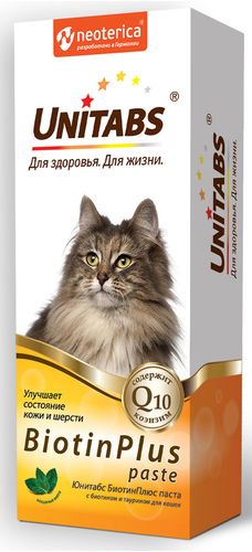 Unitabs "BiotinPlus" пасту применяют кошкам с 6-месячного возраста при сухости, неэластичности и шелушении кожи, избыточной линьке, интенсивном выпадении шерсти, ее ломкости и сухости, отсутствии у нее густоты и блеска. Задают с кормом или в чистом виде непосредственно из тюбика. Применяют перорально, ежедневно из расчета 1 г пасты на 1 кг массы животного, что соответствует 2 – 2,5 см полоски пасты из тюбика. Эту дозу можно распределить в течение дня. Паста должна быть комнатной температуры.