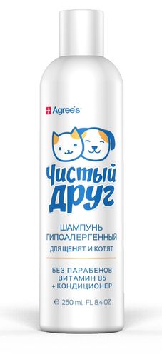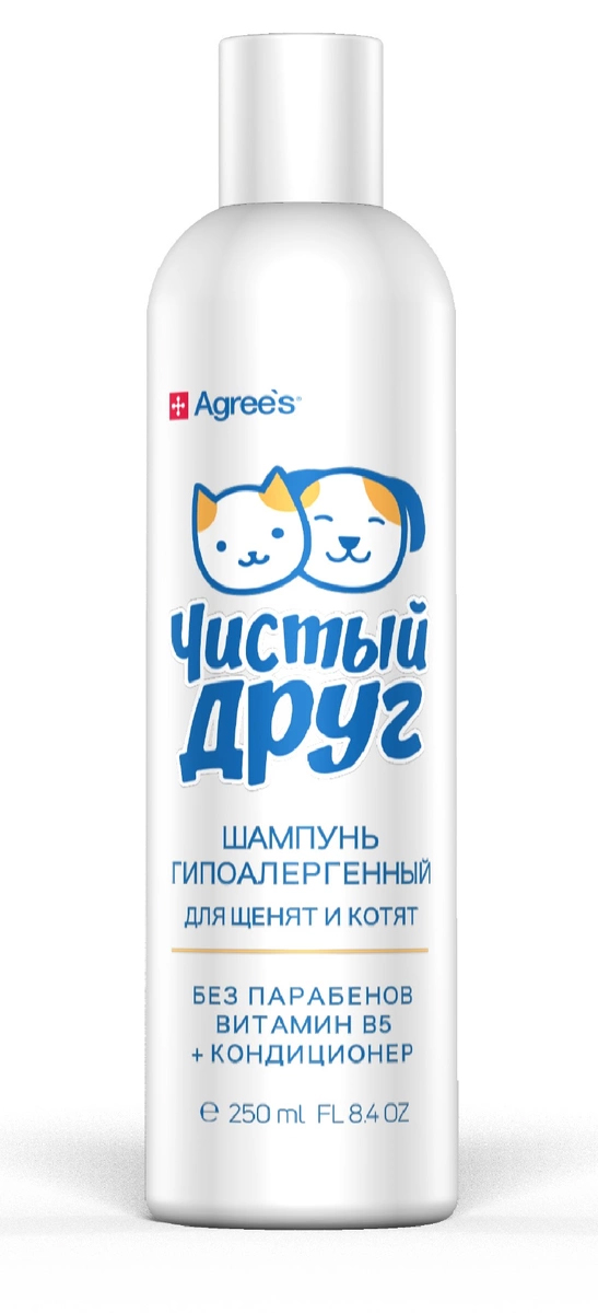 Шампунь для щенков и котят "Чистый друг" бережно очищает шерсть и ухаживает за кожей Вашего маленького питомца. Масло жожоба прекрасно увлажняет и смягчает шерсть и кожу животного. Сок алое вера и пантенол снимают воспаления, обладают отличными регенерирующими свойствами. С витаминами В5 и В12. Шампунь абсолютно безопасен при ежедневном использованииСПОСОБ ПРИМЕНЕНИЯ: необходимое количество шампуня нанести на влажную шерсть, активно помассировать избегая попадания в глаза и уши, тщательно смыть пену и насухо вытереть животное.