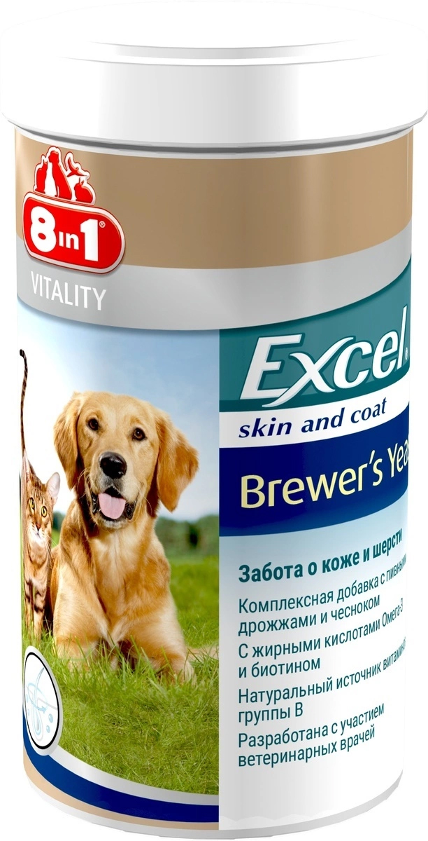 8 in 1 "Excel. Brewer's Yeast" - комплексная добавка, содержащая пивные дрожжи и чеснок, богата витаминами группы В, жиром ценных пород рыб (источник жирных кислот Омега-3). Специальный баланс витаминов и микроэлементов способствует поддержанию здоровой кожи и блестящей шерсти, стимуляции иммунной системы, улучшения аппетита, профилактики заболеваний печени у собак и кошек. Применение: