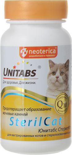 Unitabs "SterilCat" – это витаминно-минеральный комплекс предназначен для кастрированных котов и стерилизованных кошек, он содержит коэнзим Q10 и все необходимые витамины, макро- и микроэлементы. Витамины Unitabs "SterilCat" улучшают работу мочевыделительной системы, предотвращают образование мочевых камней (струвитов), Профилактируют ожирение. Порядок применения: с 8 месячного возраста, ежедневно 1 таблетку на 1 кг массы тела.